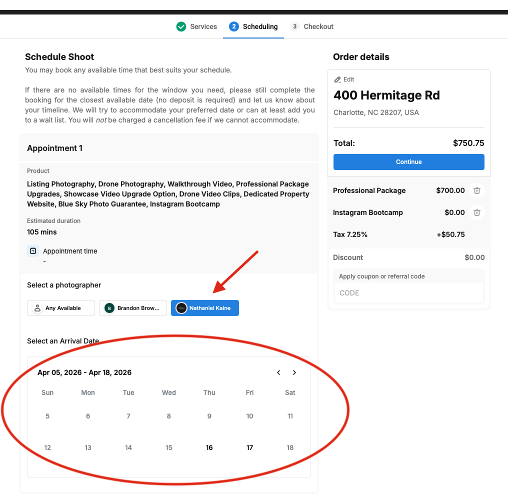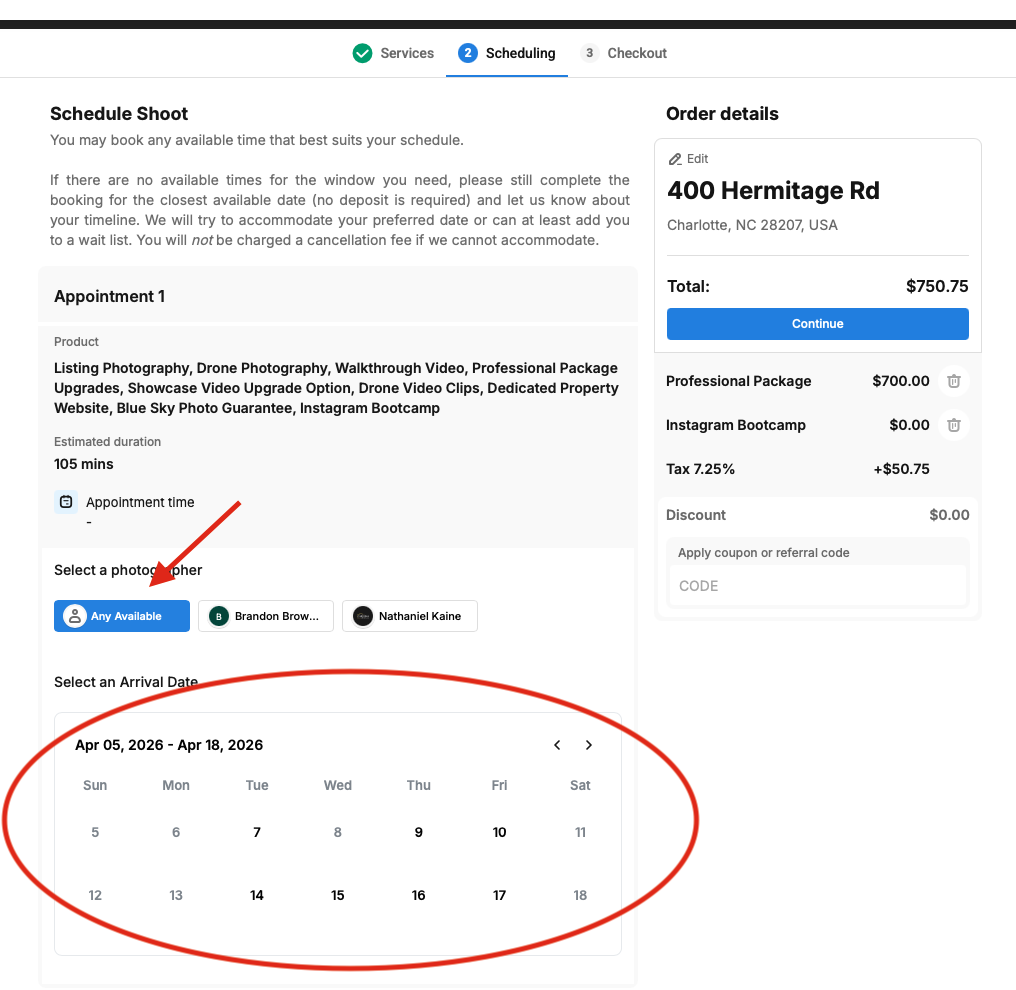 Click on a photographer’s name to book your shoot specifically with that person. Otherwise, leave it on ‘Any Available’ to see our team’s aggregate availability. Please note we are a boutique company who strive to maintain high standards and style consistency across our photographers.